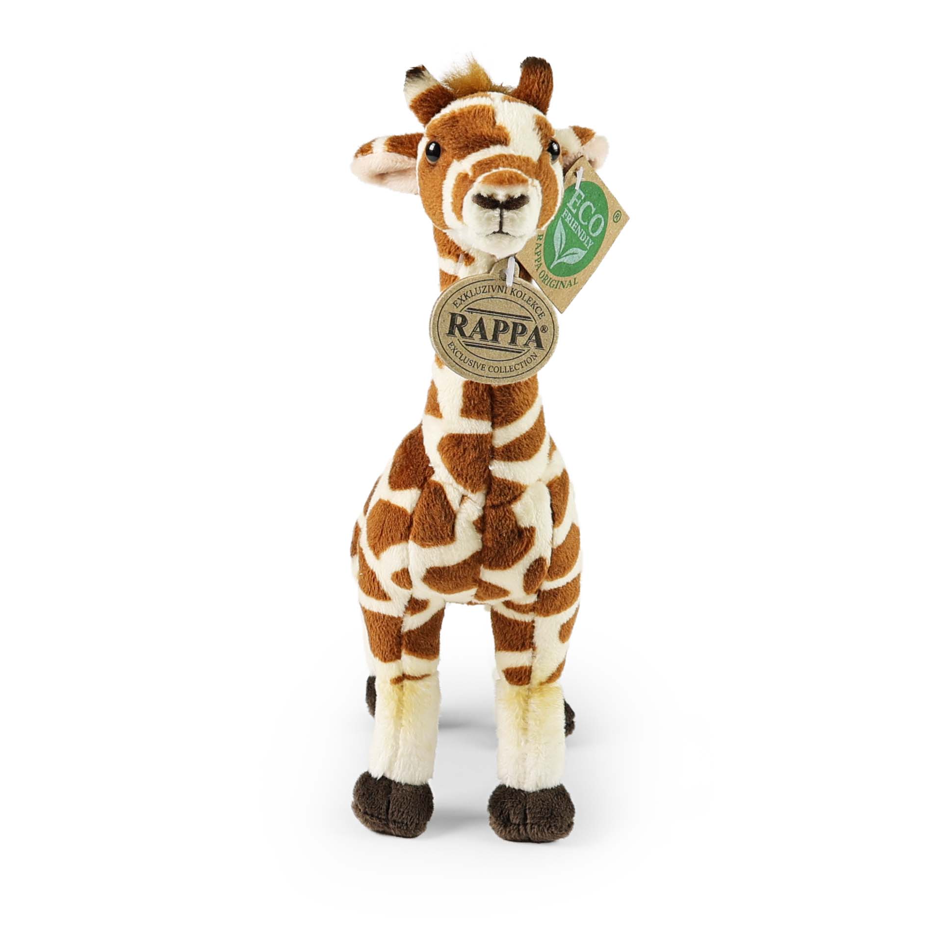 Plyšová žirafa měří 23 cm a díky těm nejkvalitnějším materiálům se řadí do Exkluzivní kolekce plyšových hraček značky Rappa. Díky ručnímu zpracování každého kusu navíc vypadá jako živá. Proč označení ECO-FRIENDLY? Rappa si je vědoma všech dopadů na životního prostředí, zaměřuje se na udržitelnost a omezení používání plastů na minimum. Proto je výplň hraček vyrobena z recyklovaných materiálů, zejména PET lahví. Ta je však zcela nezávadná a vhodná i pro děti od narození. FUN FACT: Věděli jste, že žirafy mají stejně krčních obratlů jako člověk – jenže každý měří až 25 cm?