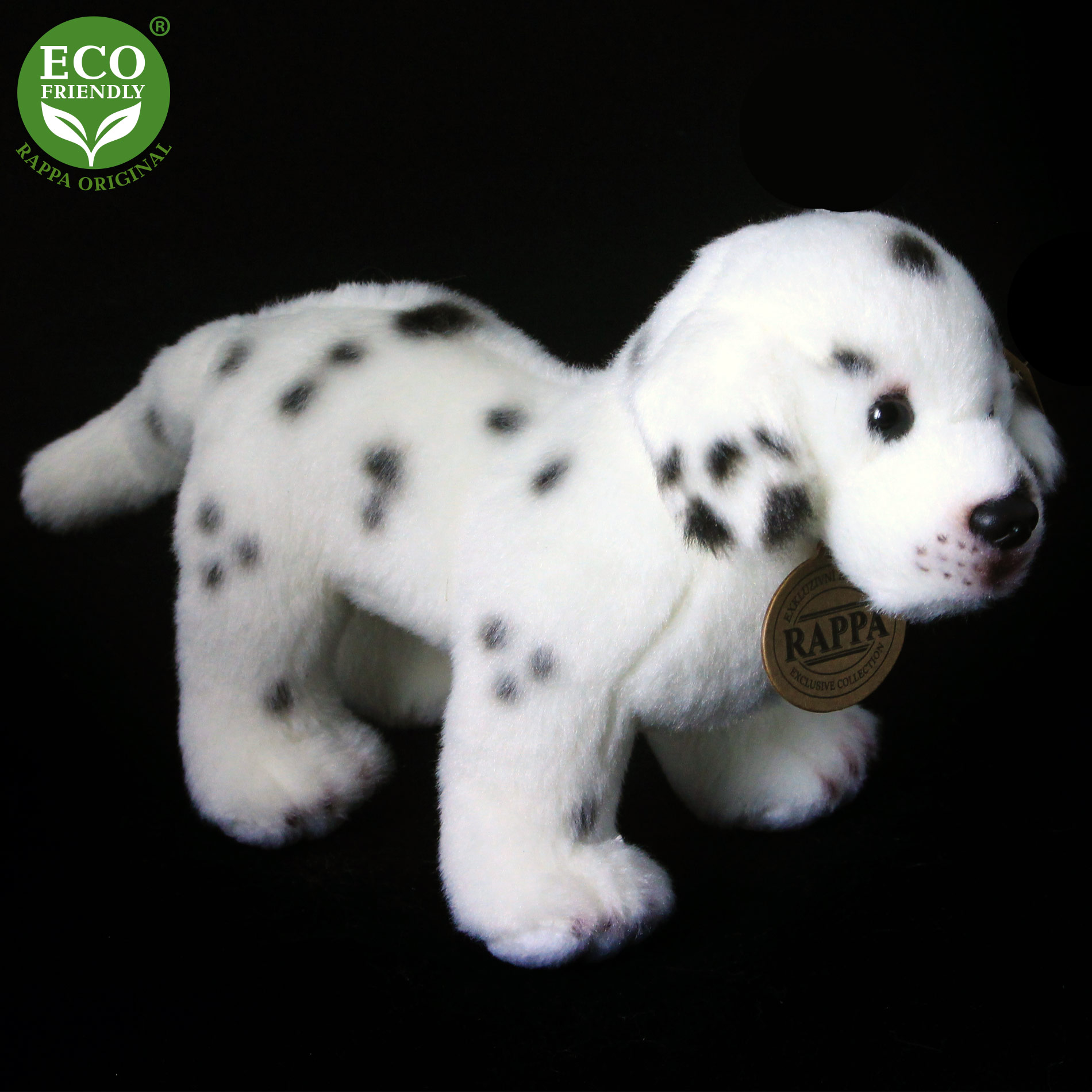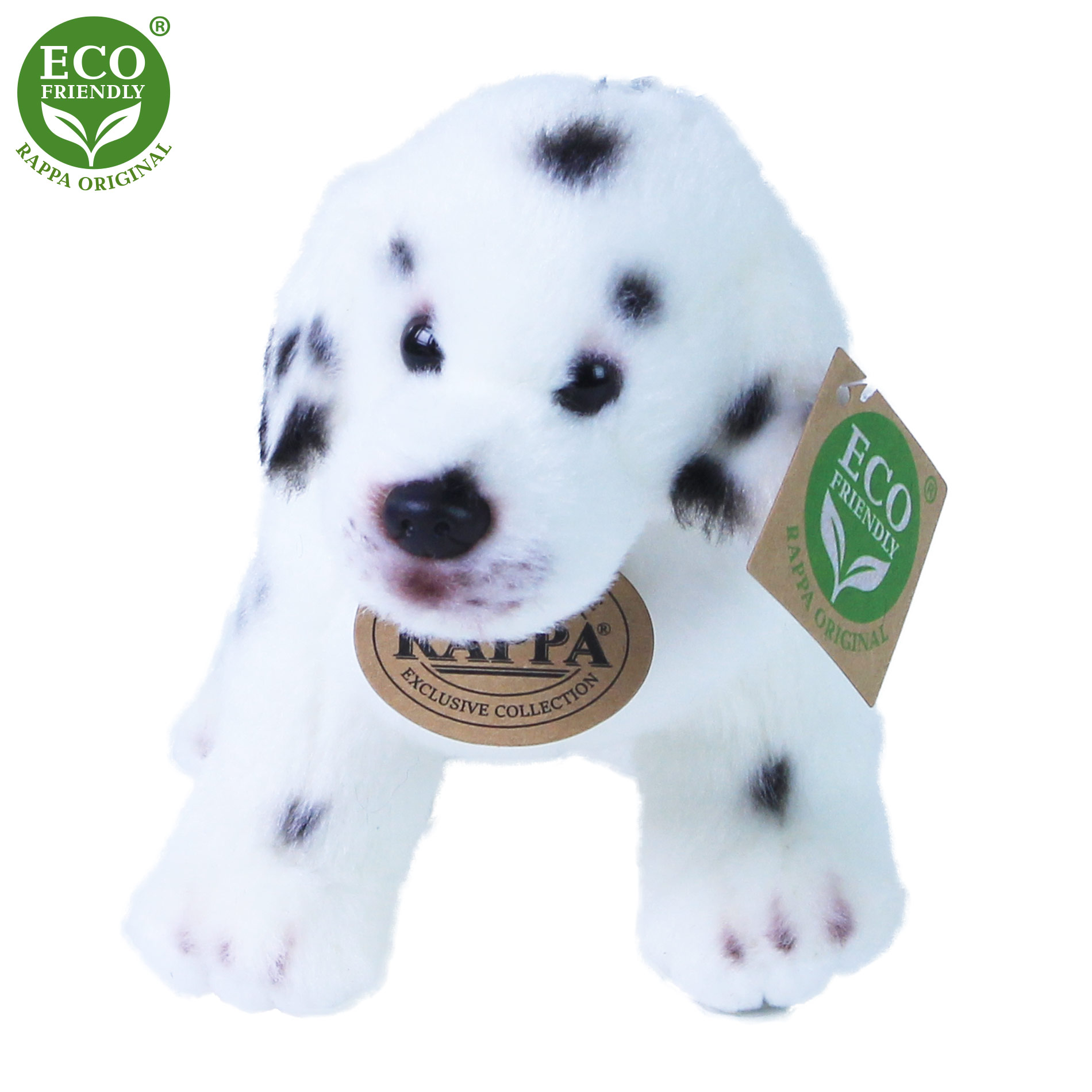 Plyšový dalmatin o velikosti 20 cm je ručně ušitý z vysoce kvalitní, jemné plyše, a díky tomu vypadá jako živý. Pro svůj roztomilý výraz se stává vítaným společníkem v jakékoliv chvíli. Je součástí exkluzivní kolekce plyšových hraček RAPPA. Rozhodli jsme se jít zelenou cestou co nejméně zatěžující životní prostředí - cestou ECO-FRIENDLY. Co to vlastně ECO-FRIENDLY znamená? Výplň plyšové hračky je vyrobena z recyklovaných PET lahví. Tento materiál je zcela bezpečný, na omak nerozeznatelný od standardní výplně a plně atestovaný pro bezpečnost i těch nejmenších.